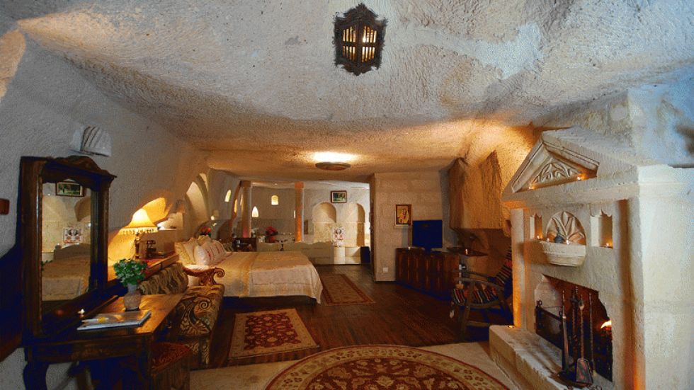 One of the guest rooms at Gamirasu Cave Hotel in Ayvali, Turkey. (Photo: Courtesy of the Gamirasu Cave Hotel)