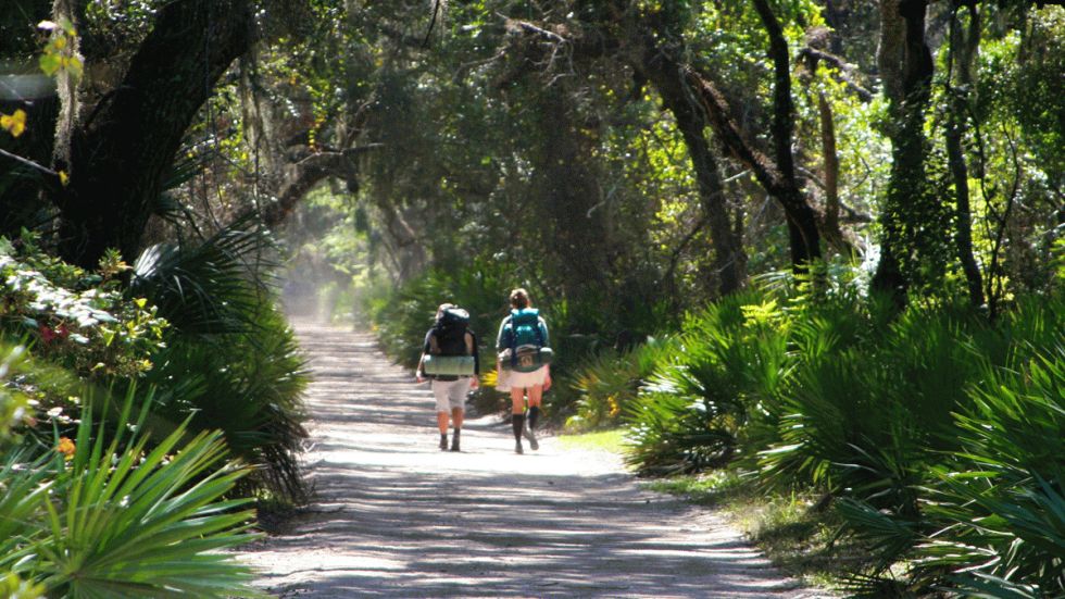 Highlights After beachcombing for sand dollars on the eastern coastline, hikers can trek into a forest of towering oak trees dressed in Spanish moss and encounter an array of wildlife, including wild horses, birds, deer, turkeys, and armadillos.