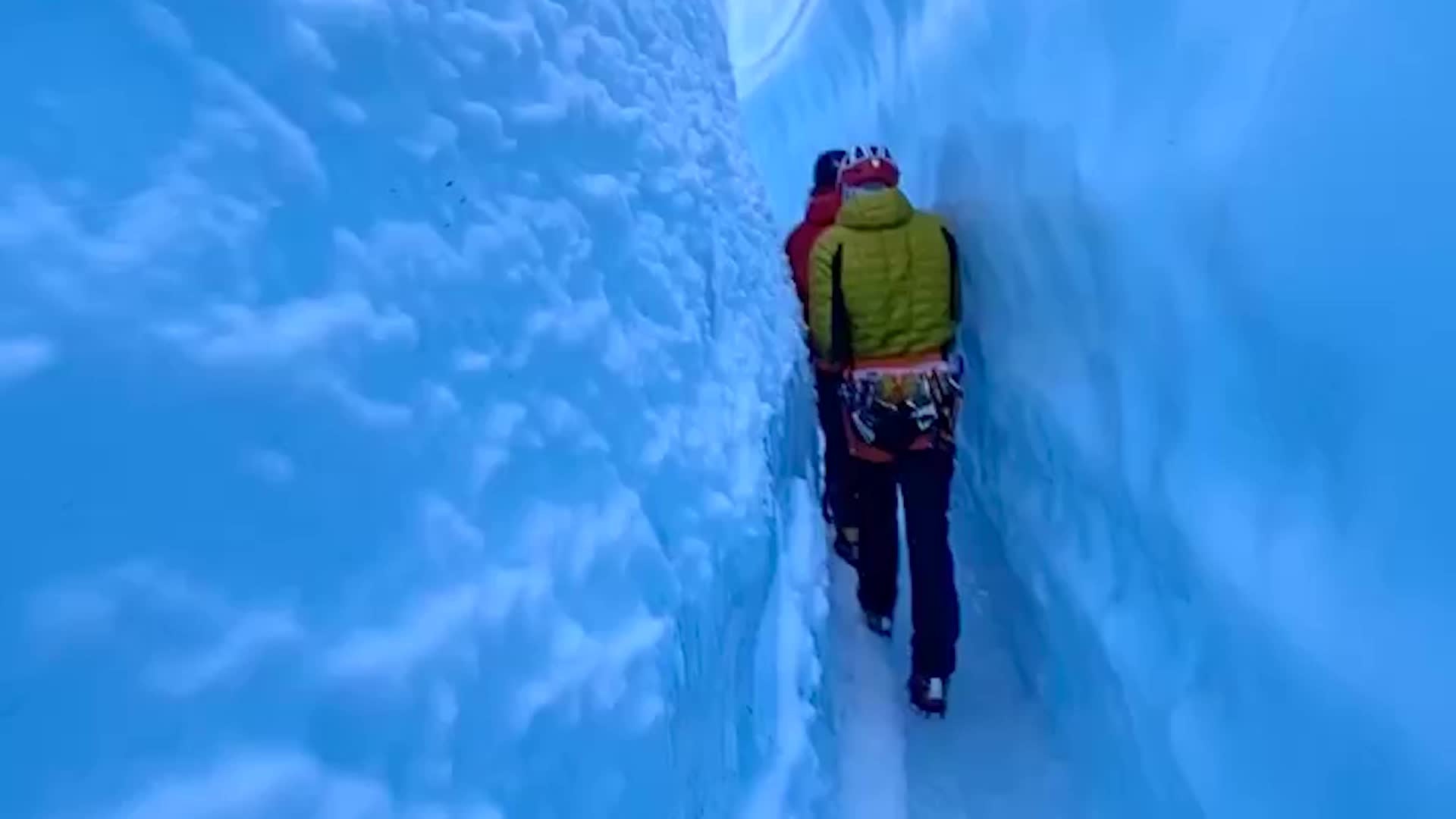 A trio of alpinists took a quick walk through a narrow crack in the Matanuska Glacier.