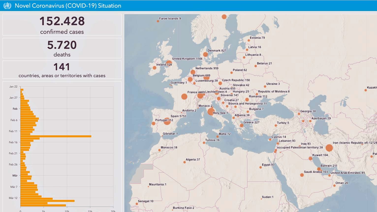 Karte und Zahlen von Sonntagmorgen, 15. März 2020, zur weltweiten Verbreitung des Coronavirus.