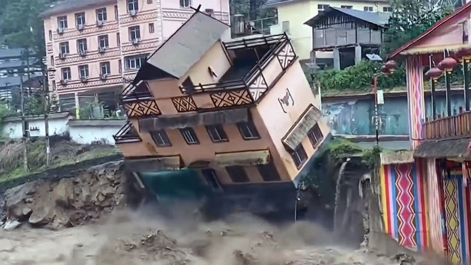 Erschreckende Szene: Haus stürzt in reißende Fluten