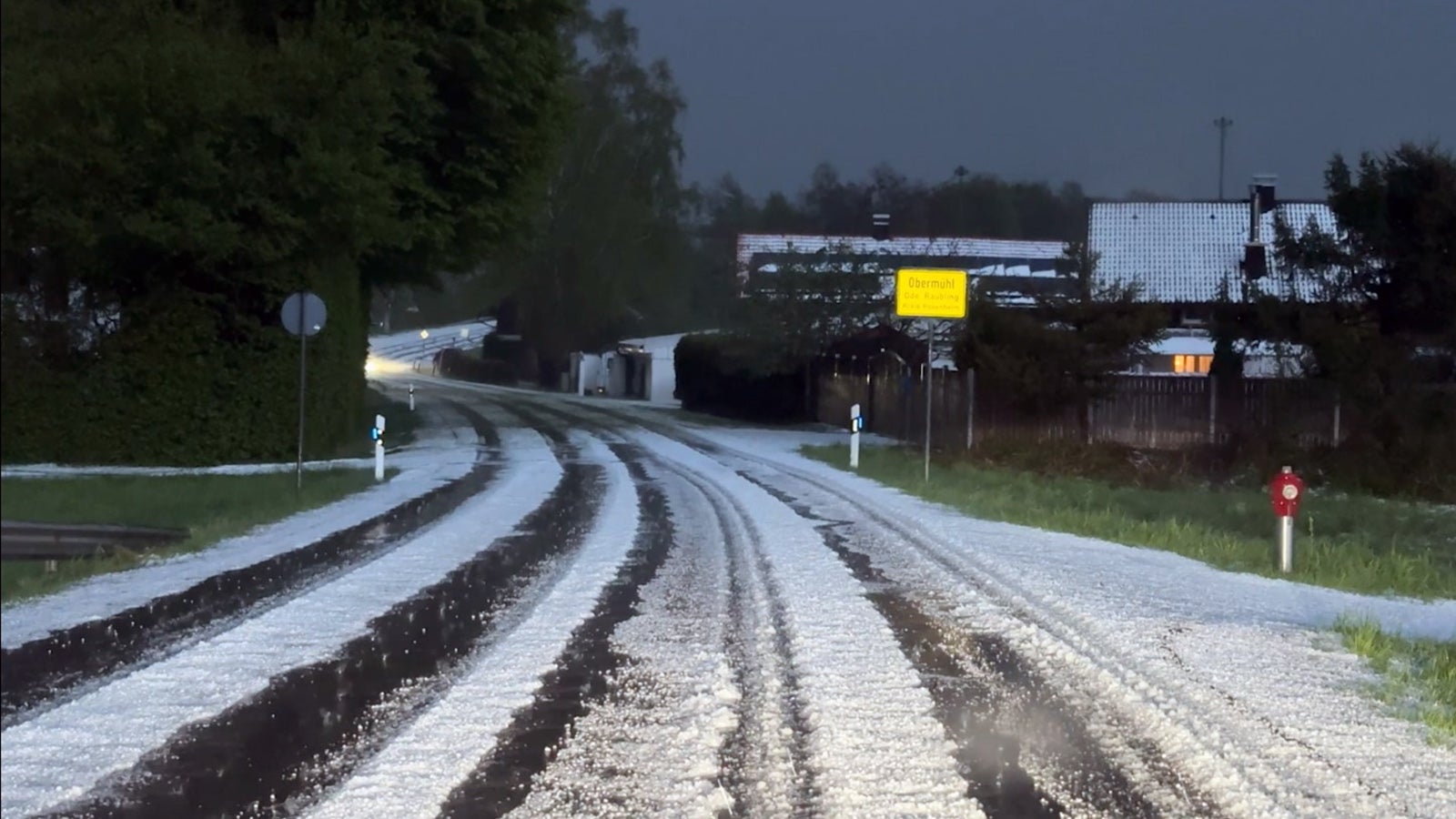 Heftige Gewitter tobten über weiten Teilen Nordbayerns. Schwerpunkt der Unwetter war das Gebiet um Raubling bei Rosenheim. Aufnahmen zeigen, wie das Hagelunwetter die Straßen der oberbayerischen Gemeinde in eine Winterlandschaft verwandelte.