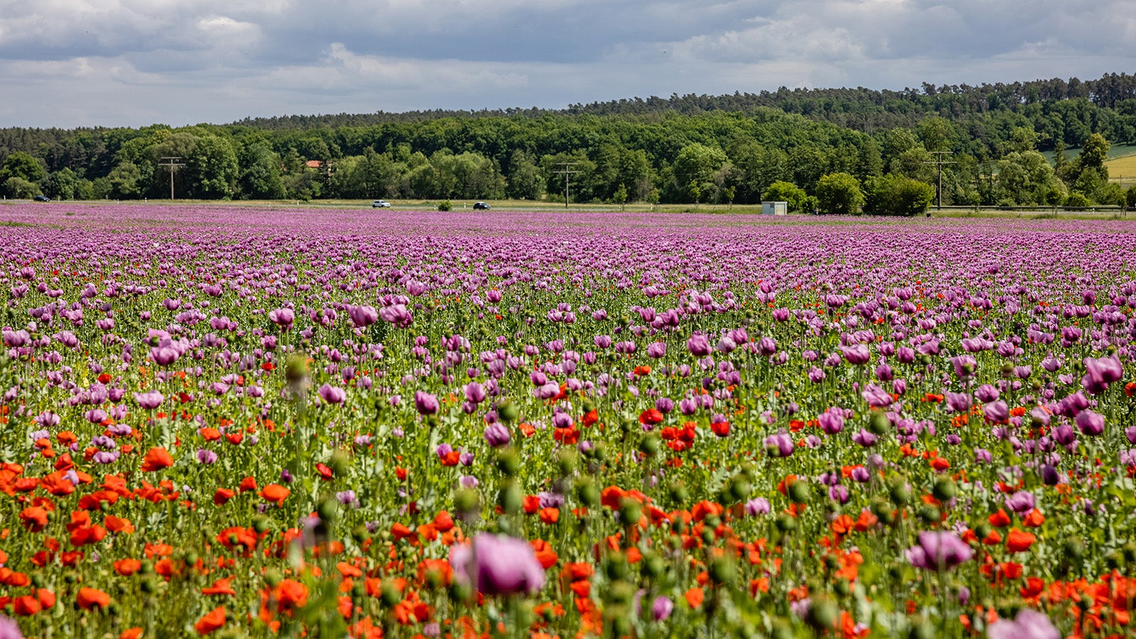 Ein riesiges Mohnfeld in Ammendorf verzaubert beim Anblick seiner leuchtenden lila und roten Blüten. Das beeindruckende Naturspektakel ist ein Vorbote des Sommers.