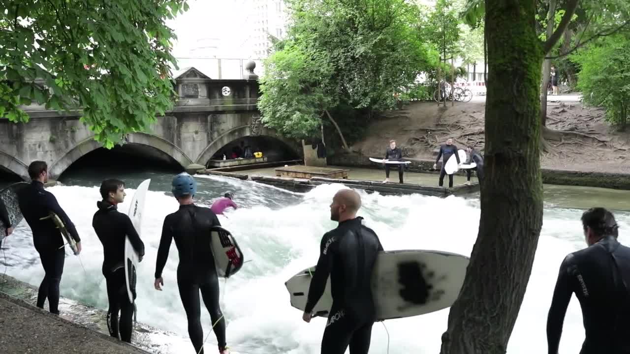 An einer Brücke am südlichen Rand des Englischen Gartens bietet sich ein ungewöhnliches Bild. Entlang des Steinufers reihen sich Surfer in schwarzen Neoprenanzügen, die abwechselnd manchmal fast schon im Sekundentakt nacheinander in den Eisbach springen. Dort steht auch Murray Keegan, sein violettes Surfbrett unter dem Arm, in der Schlange und wartet. Das Geräusch vorbeifahrender Autos wird nur von dem Tosen des eiskalten Wassers übertönt. Mitten in München, hat sich hier über Jahrzehnte hinweg ein Hotspot für Surfer etabliert, der mittlerweile weltberühmt ist: die Eisbachwelle.