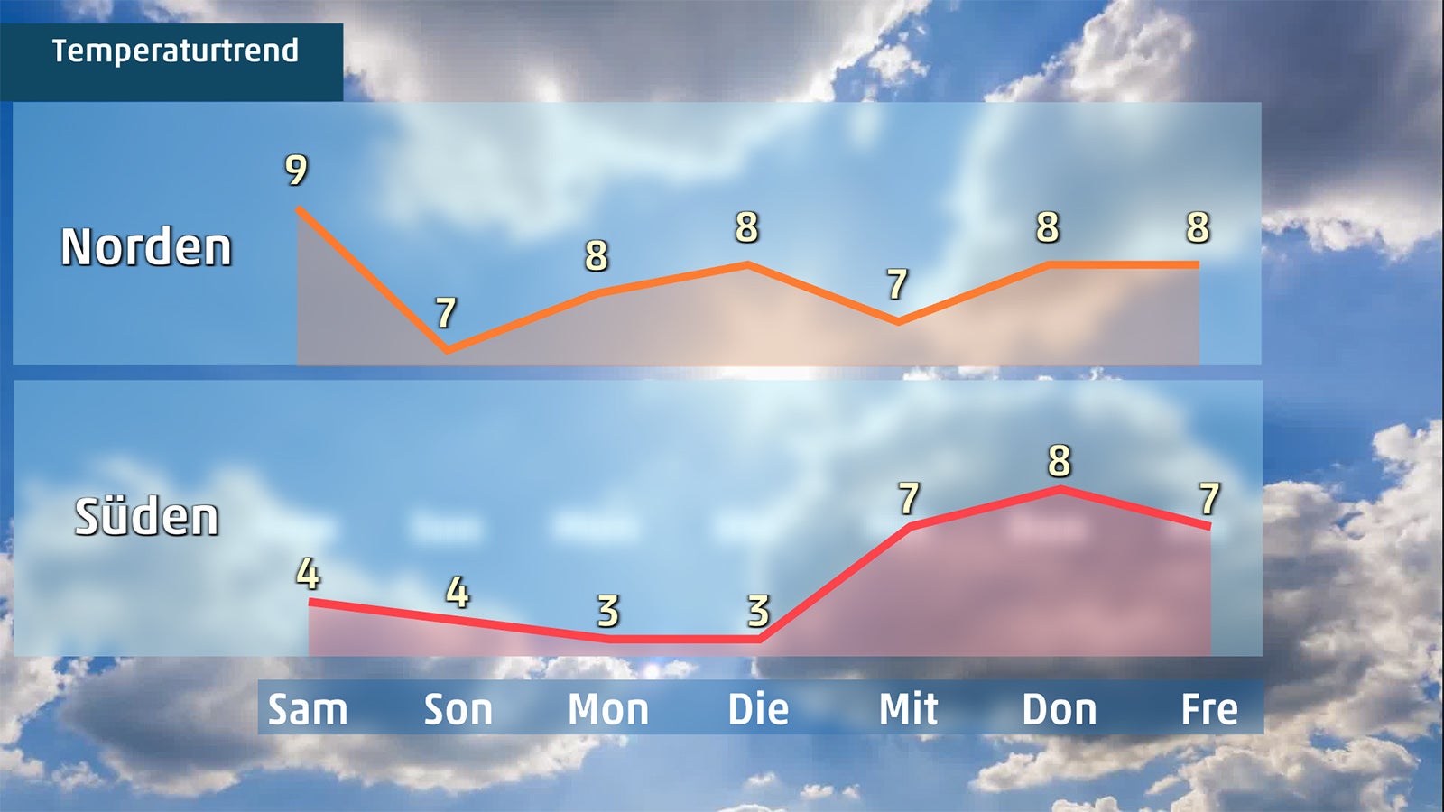 Am Donnerstag ist Deutschland in Sachen Wetter zweigeteilt: Während es im Südosten zunächst weiterhin meist trocken und freundlich bleibt, frischt im Nordwesten der Südwestwind zunehmend auf und sorgt hier für häufige Regenschauer. Regional ist hier auch Dauerregen möglich. Gerade in den Abendstunden ist im Nordwesten mit stürmischen Böen zu rechnen. Die Höchstwerte liegen dabei zwischen 4 Grad im Bayerischen Wald und 11 Grad im Kraichgau.