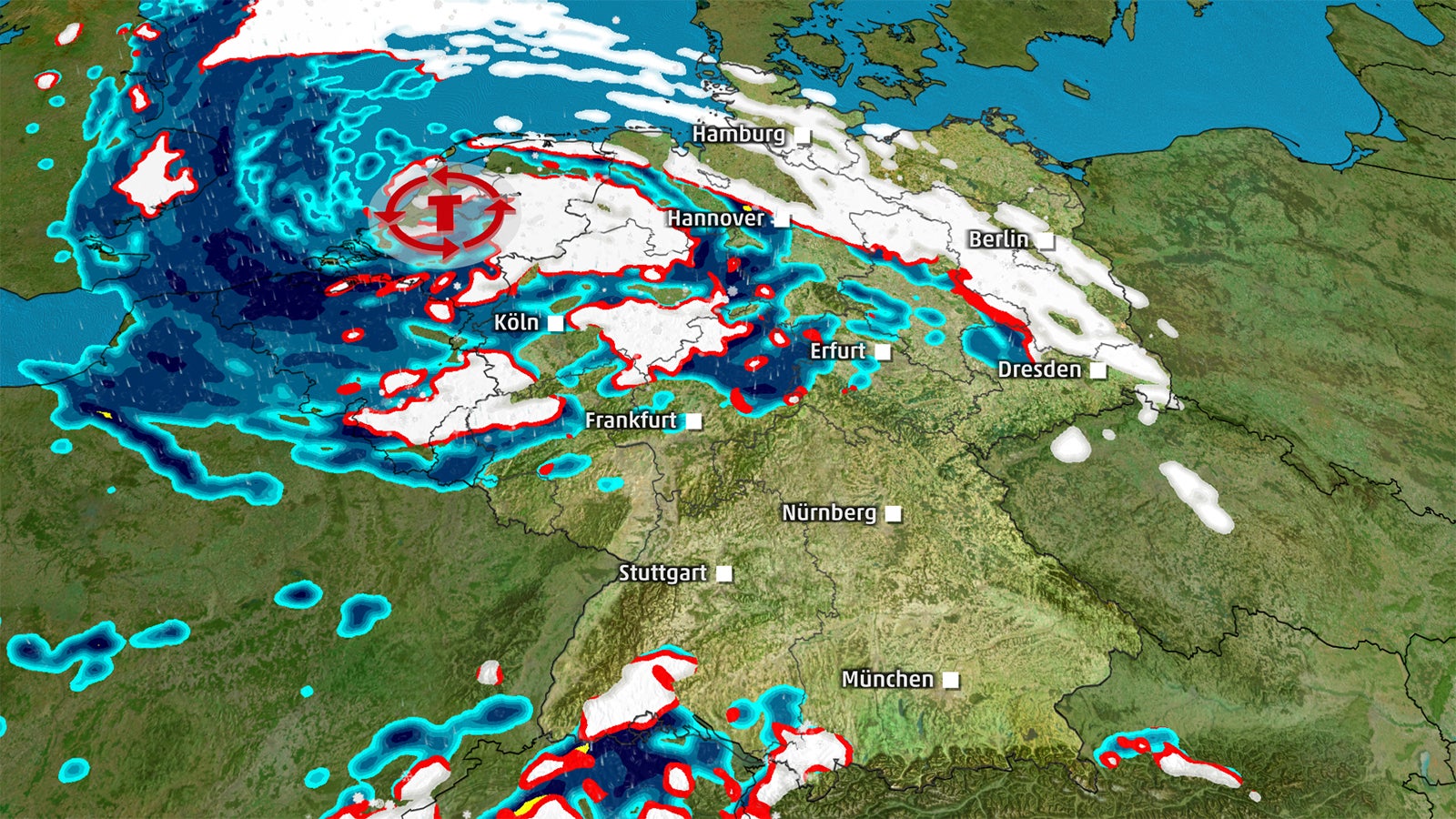 Neben dem Bombenzyklon kommen noch mehrere Unwetter ins Spiel. Denn gleichzeitig zum Sturm schneit es kräftig, vor allem im Norden und Osten. Zwischen Hamburg und Berlin kann es bis zu 30 Zentimeter Neuschnee geben. Dazu drohen Schneeverwehungen, auch auf Autobahnen. Östlich der Elbe könnte man am Freitag regelrecht regelrecht einschneien. Durch den Wind kann sich der viele Schnee auftürmen. Ob die Bahn dann noch fährt, ist alles andere als sicher.