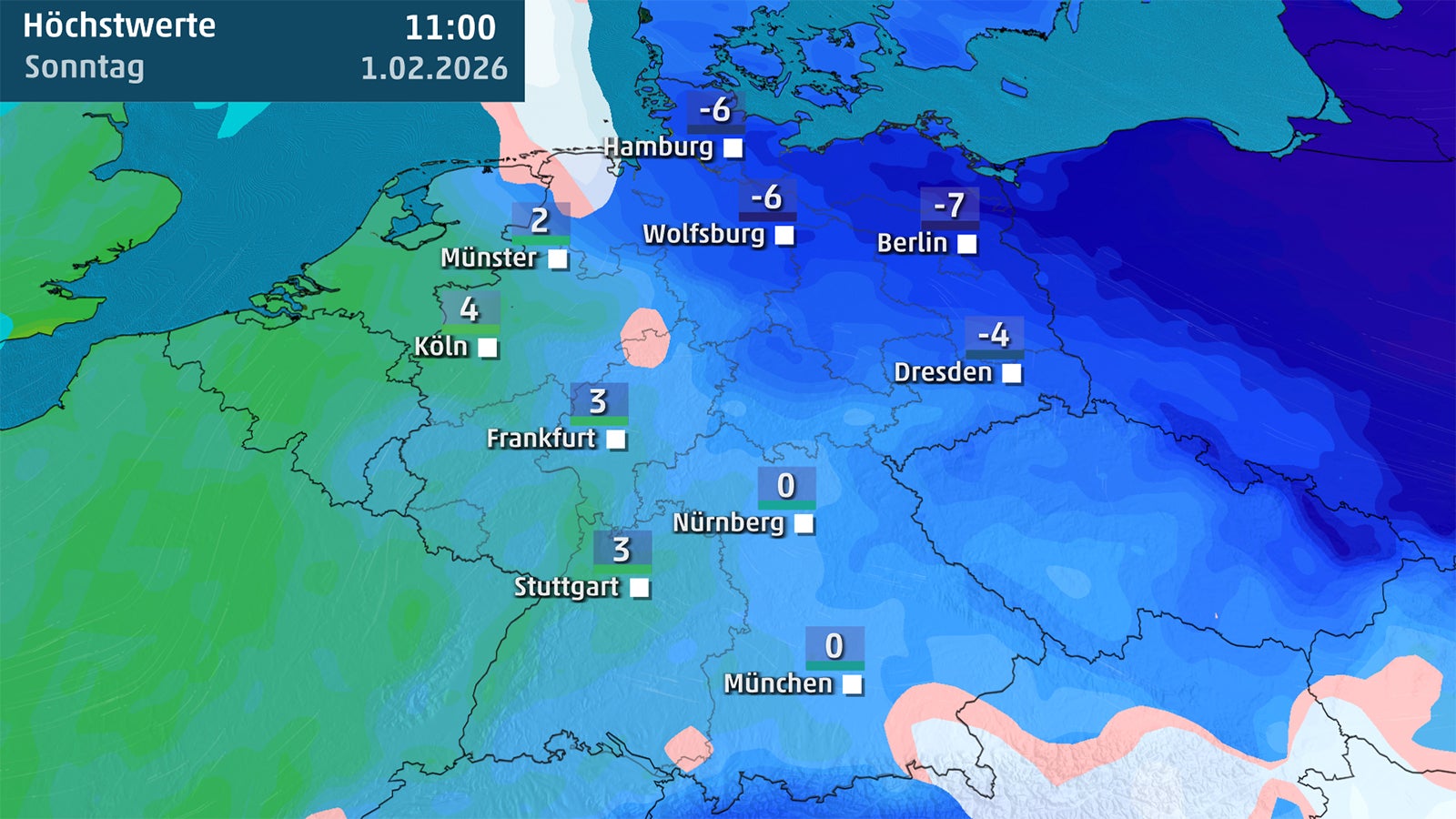 Ganz anders präsentiert sich der Nordosten. Hier bleibt es am Samstag zwar trocken, doch kalte Luftmassen aus Skandinavien und Osteuropa bestimmen das Wetter. Die Höchsttemperaturen verharren im Dauerfrost zwischen 0 und -6 Grad, mit den niedrigsten Werten nahe der polnischen Grenze.