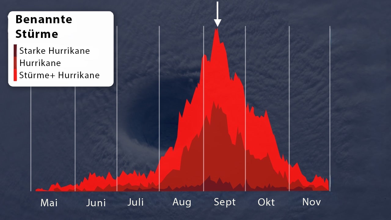 Für Wetterbeobachter ist das ein ungewöhnliches Bild vom Atlantik im September. Normalerweise ist die zweite Septemberwoche die aktivste Zeit für Hurrikane. Historische Daten der vergangenen 80 Jahre belegen, dass Mitte September die meisten atlantischen Wirbelstürme auftreten. Der Höhepunkt der Saison fällt normalerweise auf den 10. September. Doch dieses Jahr ist anders.
