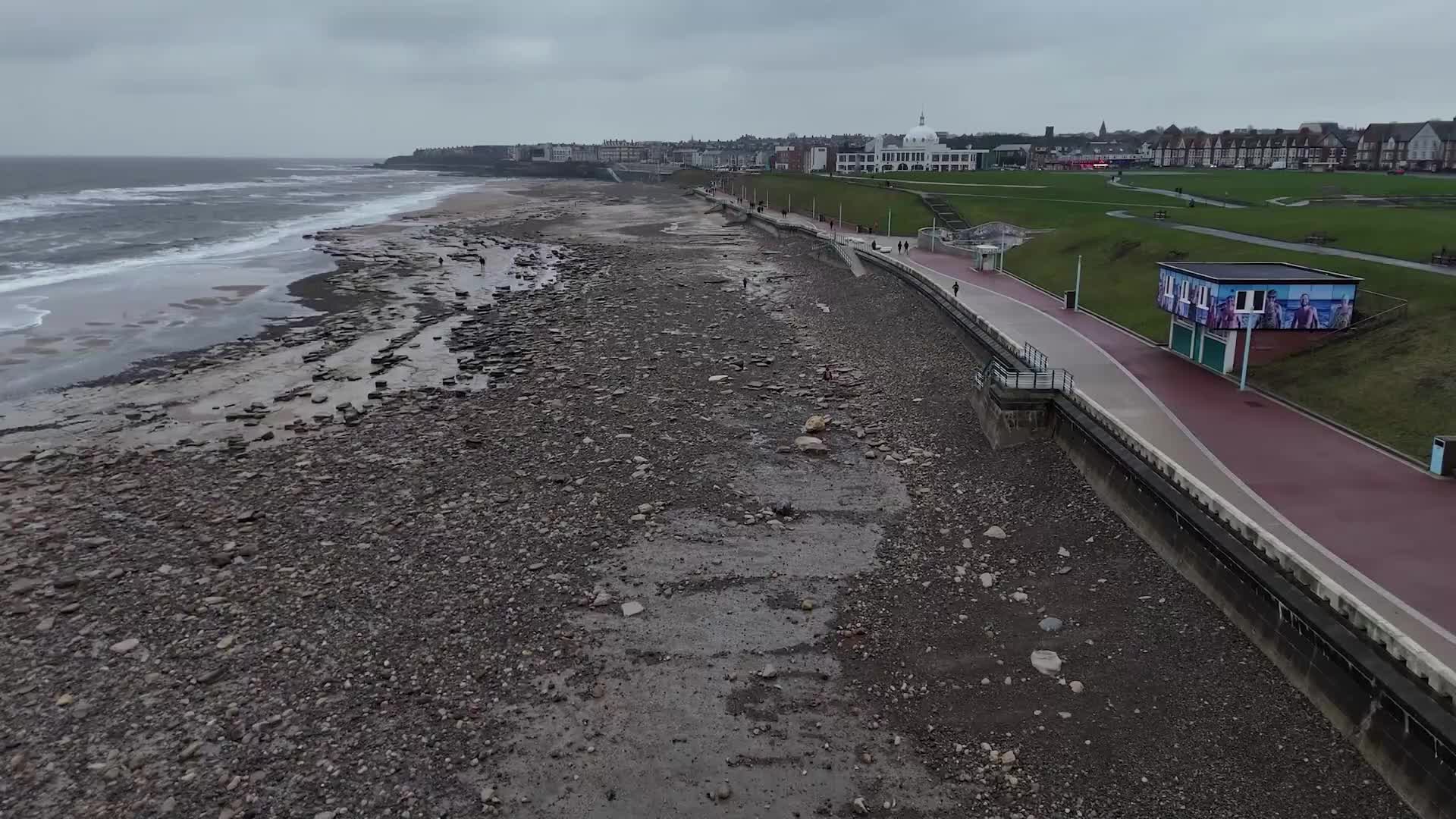 Der Whitley Bay Beach ist eigentlich bekannt für seine goldenen Sandstrände. Doch die jüngsten heftigen Winterstürme haben den beliebten Ausflugsort in North Tyneside in der Grafschaft Tyne and Wear in eine Landschaft aus Felsen und Kieselsteinen verändert. Drohnenaufnahmen zeigen das Ausmaß der Veränderungen, die den Strand nahezu unkenntlich macht.