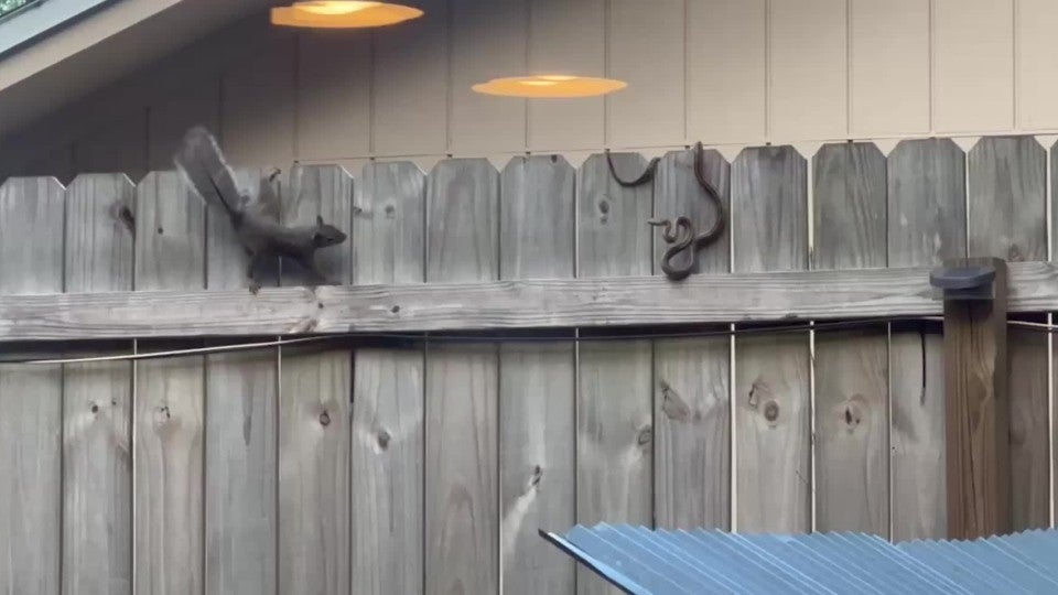 Ein Eichhörnchen will in Florida seinen Weg auf einem Zaun fortsetzen - doch eine angriffslustige Schlange lauert auf das Tier.