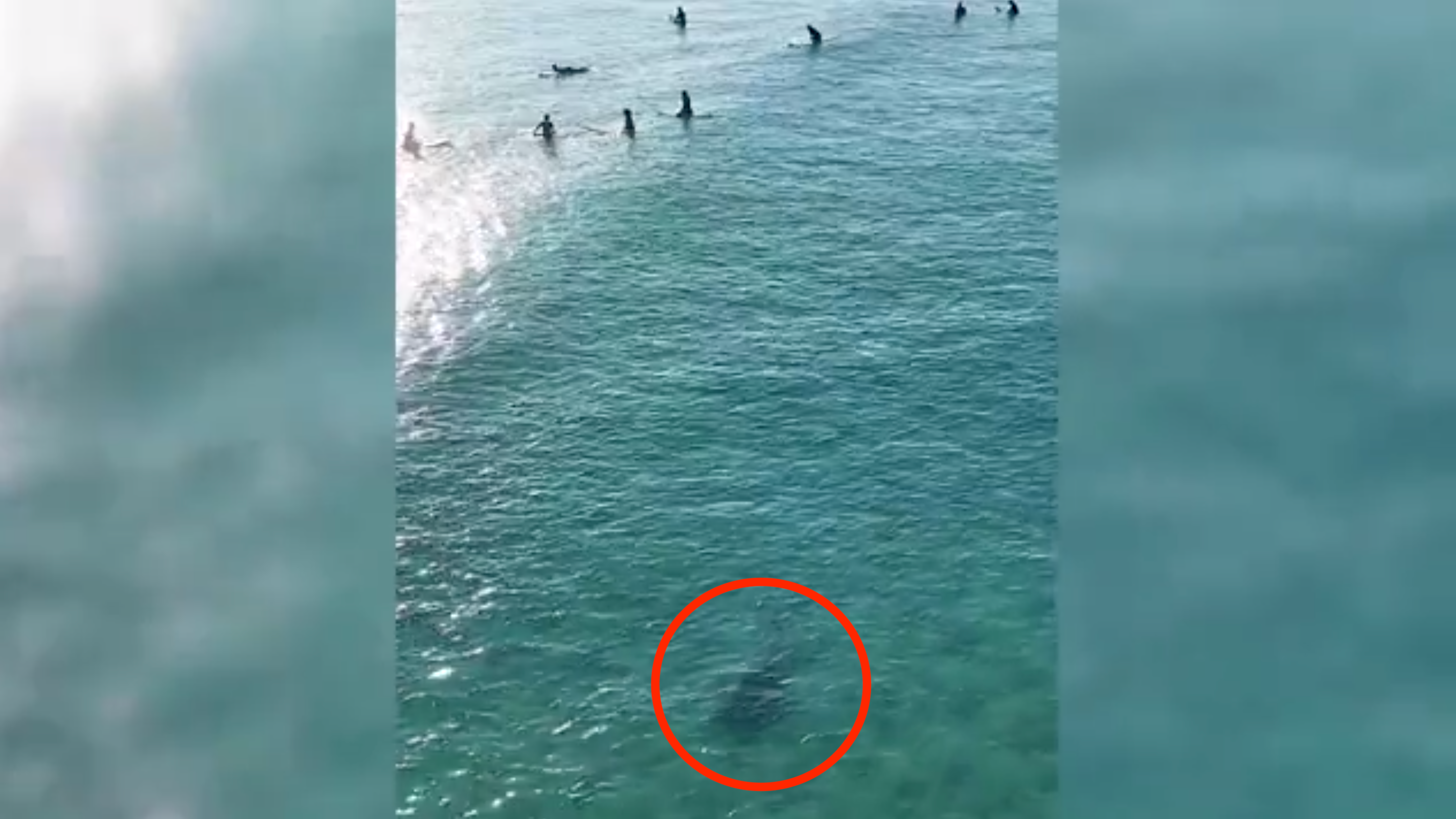 Eine Drohnenaufnahme zeigt den Moment, in dem ahnungslose Surfer unweit eines Bullenhais surfen.