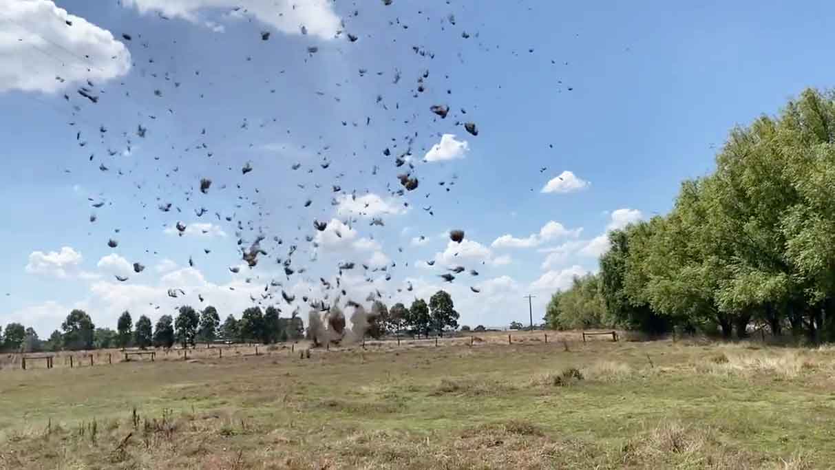 Dieser beeindruckende Wirbel aus Heu wurde in Australien gesichtet. Es sah so aus, als würden Gras und Heu einfach am Himmel schweben.
