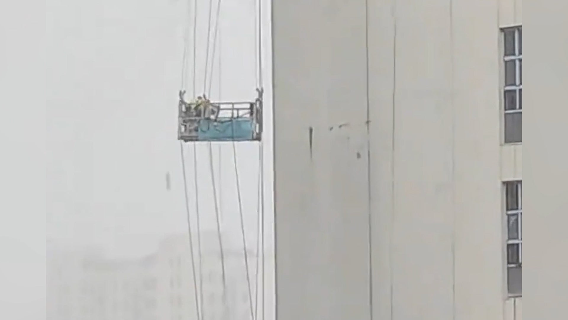 Dos hombres quedaron colgando de un rascacielos durante la tormenta. Los limpiadores se aferraron a la góndola descontrolada hasta que los bomberos pudieron llegar y estabilizar el aparejo.