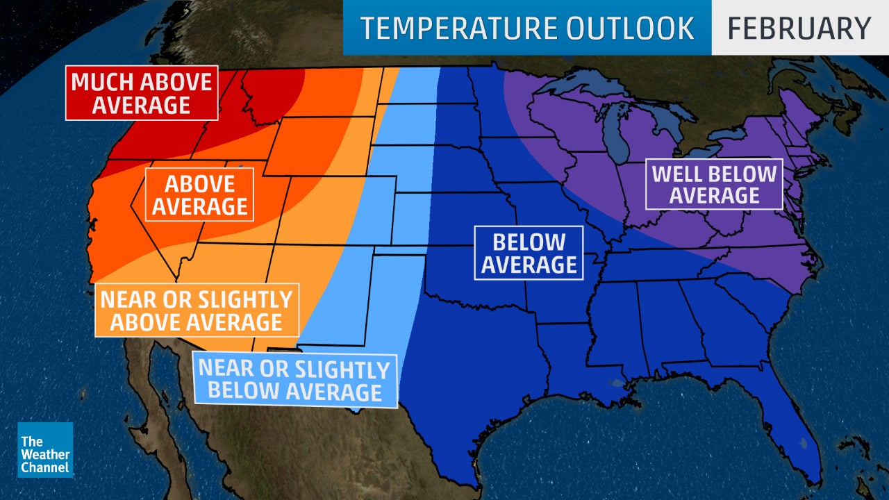 Far-below-average temperatures are likely in those regions, with below-average temperatures also reaching into much of the Plains, Mississippi Valley and South. February is normally the coldest month of the year in many of these areas, but the outlook calls for even colder weather than usual.