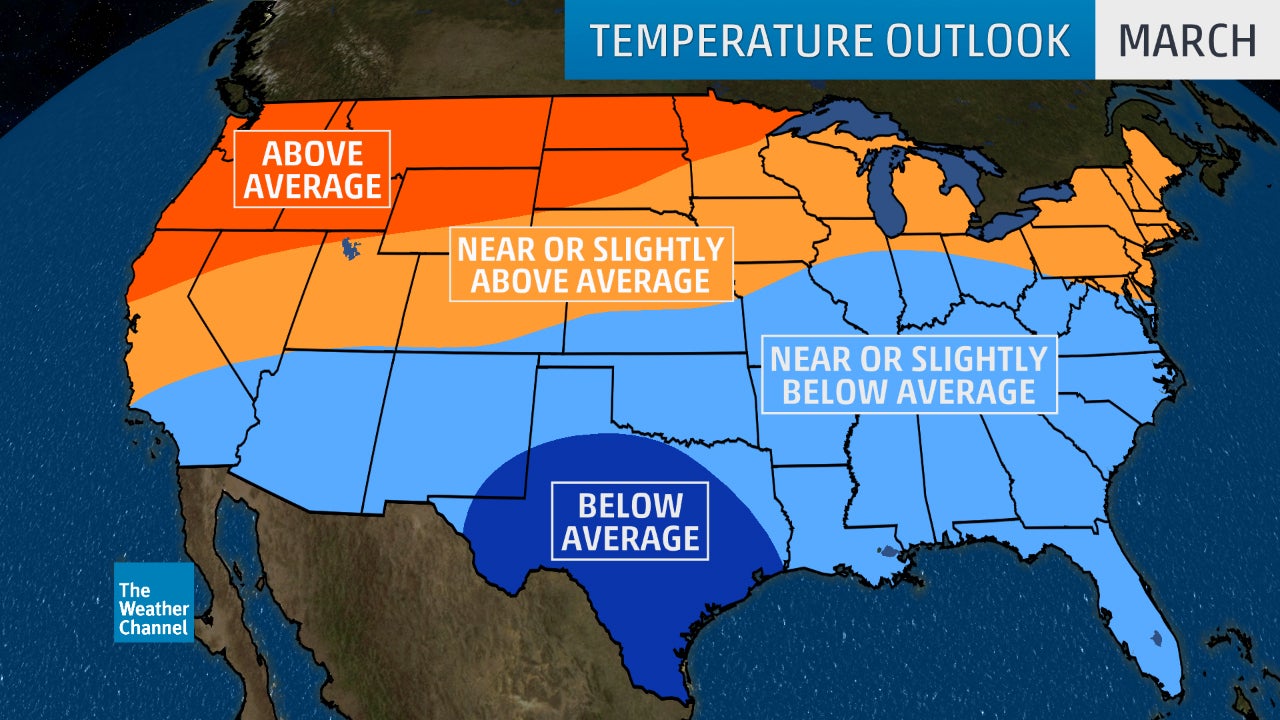 However, temperatures are expected to be near-average or slightly colder from the lower Midwest into much of the South and Southwest. Parts of Texas will likely experience the coldest temperatures relative to March averages.