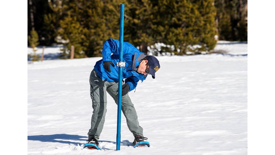 A California Department of Water Resources staffer conducts the first Phillips Station manual snow survey of 2019 on Thursday, Jan. 3, 2019.
