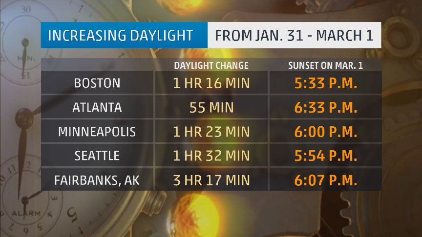 From the beginning of February until the end of the month, much of the U.S. sees about an additional hour of daylight.