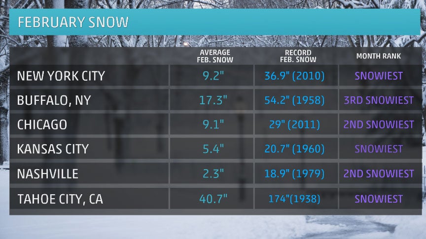 What's more, February is the snowiest month for some locations. This includes New York City, which receives nearly 10 inches of February snow, on average, and Tahoe City, California, which typically picks up about 40 inches of snow during the month.