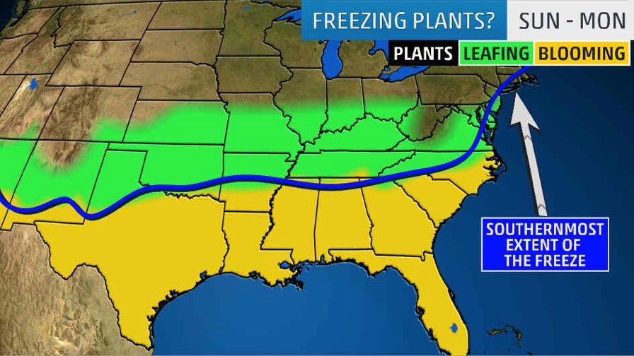 Trees are in bloom across nearly all of the Deep South and much of Texas, according to the National Phenology Network. The coldest air won't reach that far south, but it might impact some areas that are beginning to see trees bud.