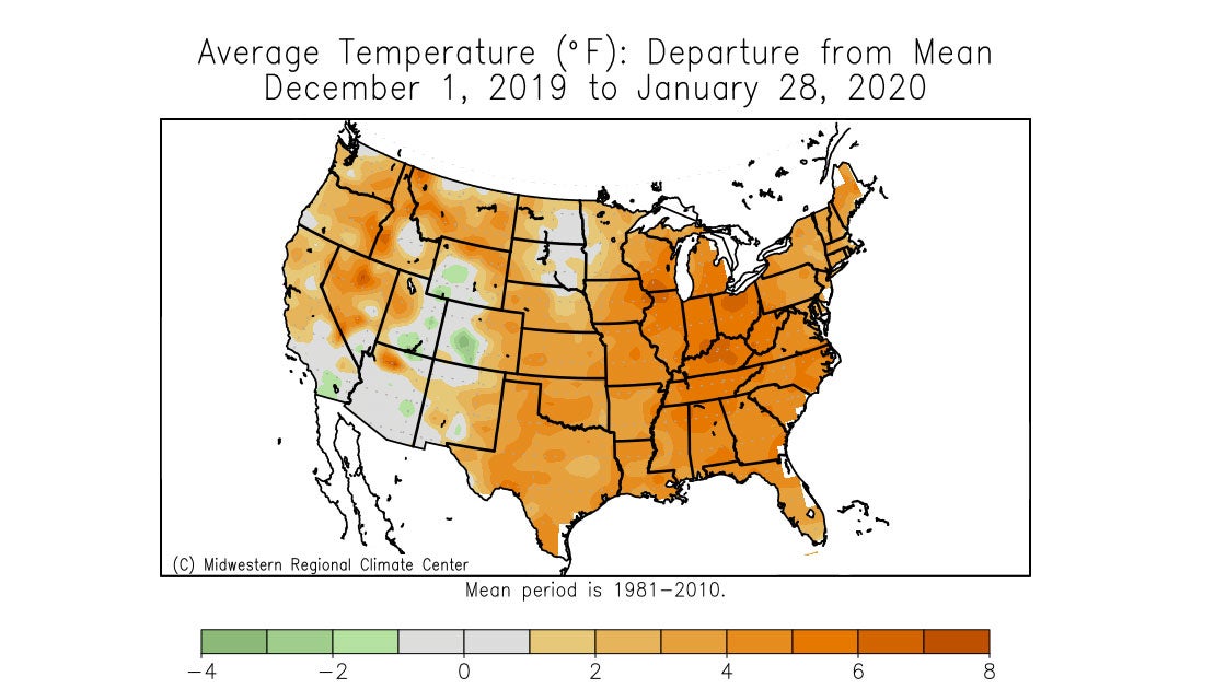 Most areas east of the Rockies, along with much of the West, have recorded above-average temperatures since meteorological winter began on Dec. 1, according to the Midwestern Regional Climate Center.