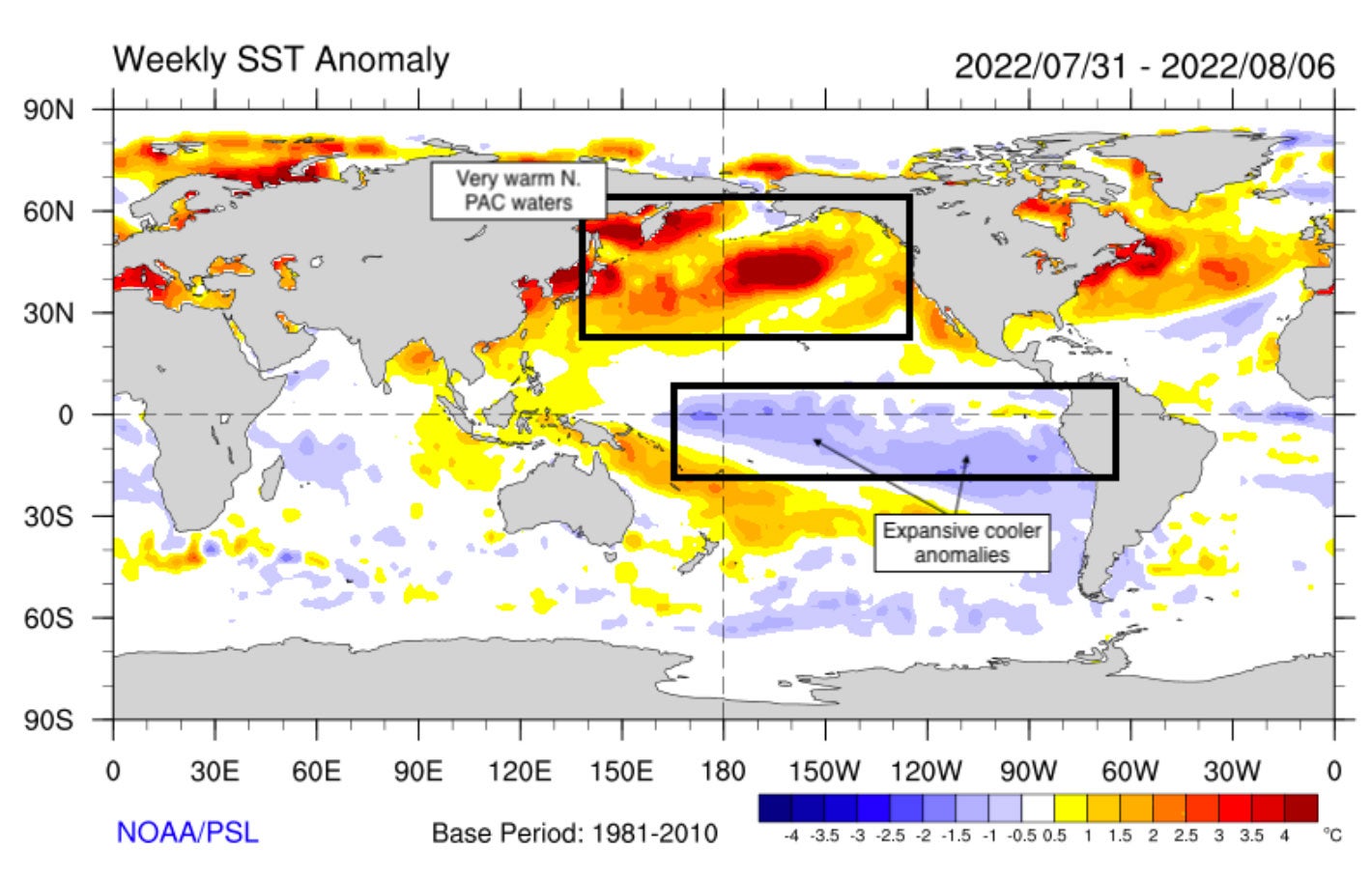 Weekly sea-surface temperature anomaly from July 31, 2022 through Aug. 6, 2022.