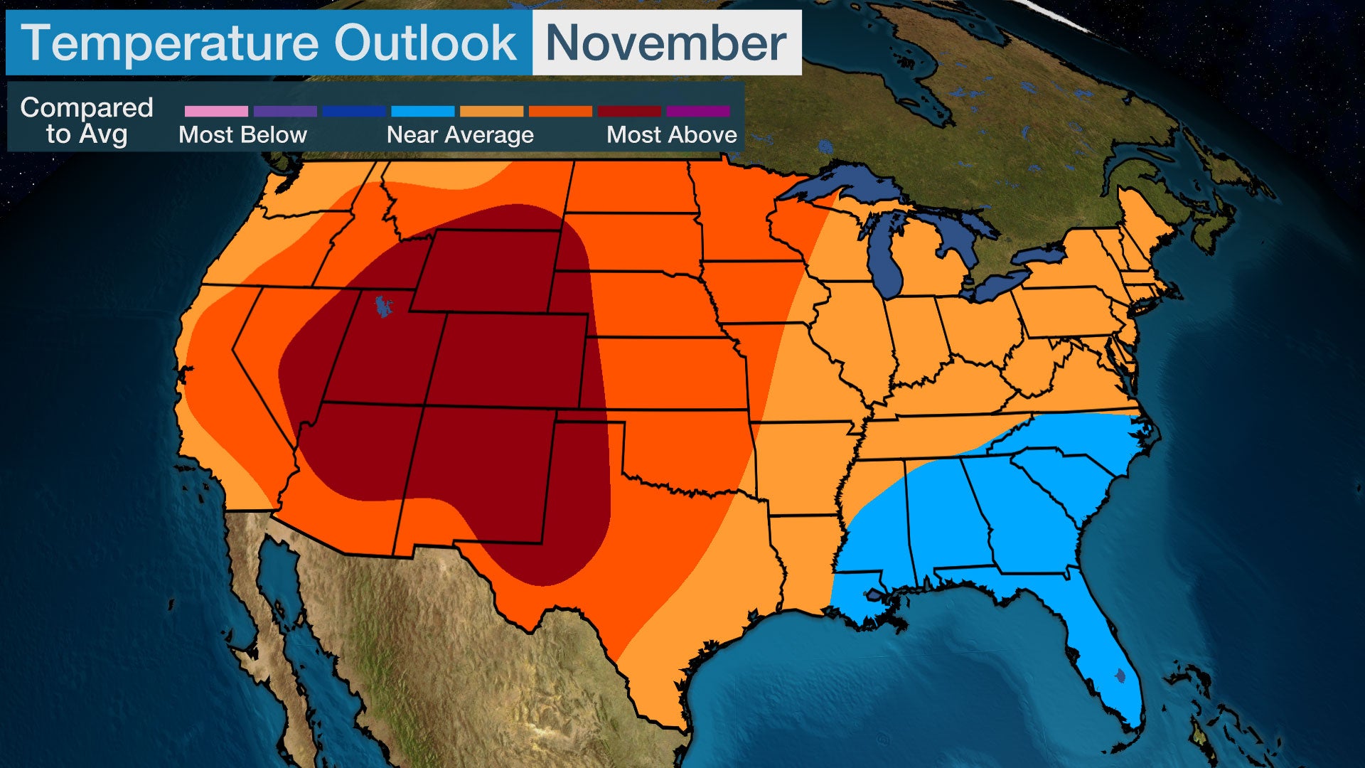 The focus of the warmer-than-average temperatures will be in the West as fall comes to a close. Above-average temperatures will also extend into much of the Plains and the upper Mississippi Valley.