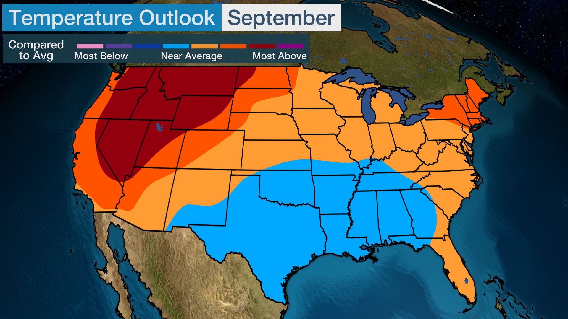 Temperatures will be the farthest above average from the Great Basin into the Northwest, the northern Rockies and parts of the Northern Plains. Above-average temperatures are also anticipated in the Northeast as fall begins.