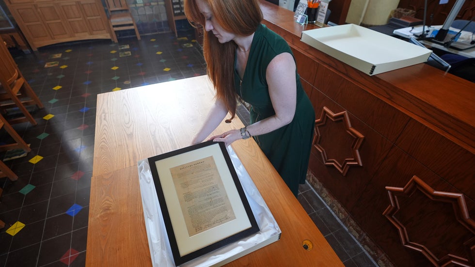 The 1865 Juneteenth General Order No. 3 is displayed by Kaitlyn Price, curator of collections for the Dallas Historical Society, at the Fair Park Hall of State in Dallas, Friday, June 6, 2025.