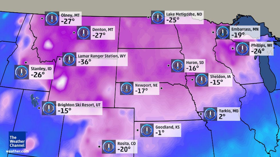 Temperatures reached the double digits below zero Tuesday morning in at least 12 states from Idaho to Wisconsin (13 if one counts Mount Washington in New Hampshire). The coldest spots were near the Wyoming-Montana border, with 36 below zero reported at Lamar Ranger Station in Yellowstone National Park and 34 below zero at West Yellowstone Gate in Montana.