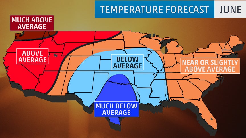 In contrast, areas from the Pacific Northwest through the northern Rockies are forecast to see temperatures most above average in June.