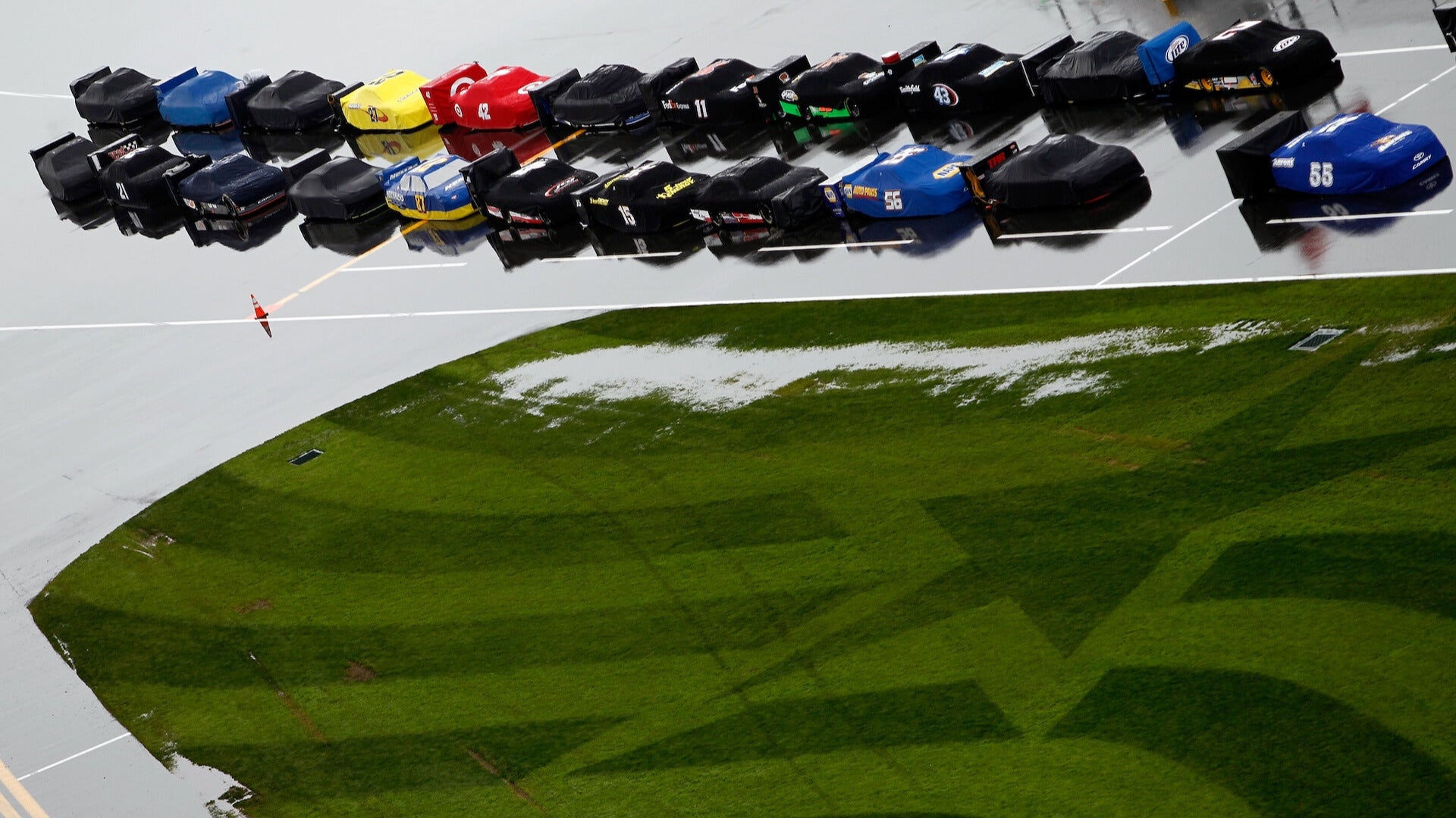Cars sit covered on the grid during a rain delayed start of the NASCAR Sprint Cup Series Daytona 500 at Daytona International Speedway on February 26, 2012.