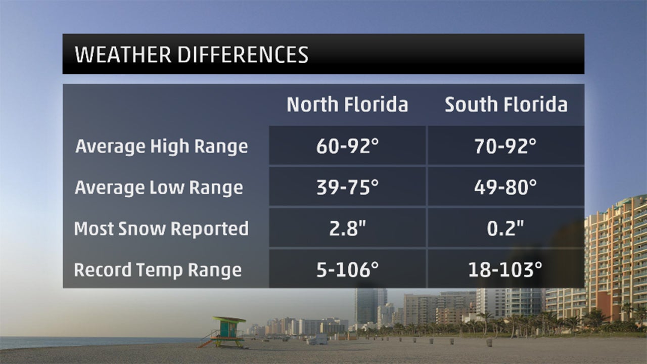 North Florida also sees larger temperature extremes. Cold fronts do not always make it through South Florida, but they do bring changes in temperature and humidity to North Florida.