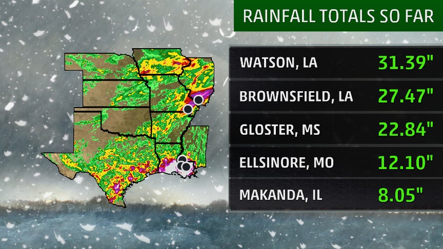 At least four locations in Louisiana saw more than 2 feet of rain, with the highest amount being 31.39 inches near Watson. Record flooding was observed on at least eleven river gauges in Louisiana.