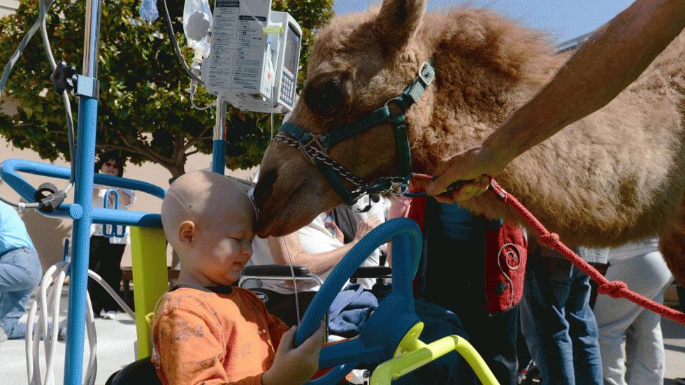 You wouldn't think a 2000-pound camel would be able to even get inside a hospital or assisted living facility, but Hump-Free and Keesa don't seem to have any problem doing just that. The two therapy camels visit children and the elderly, who benefit greatly from these encounters. "We put our old folks into a box, (referring to rooms in a nursing home), and they don't have contact with nature," Robin Lyon of Lyon Ranch said "They get a lot of stimulation from the sight of this large animal walking in, and are able to feel the soft fur."