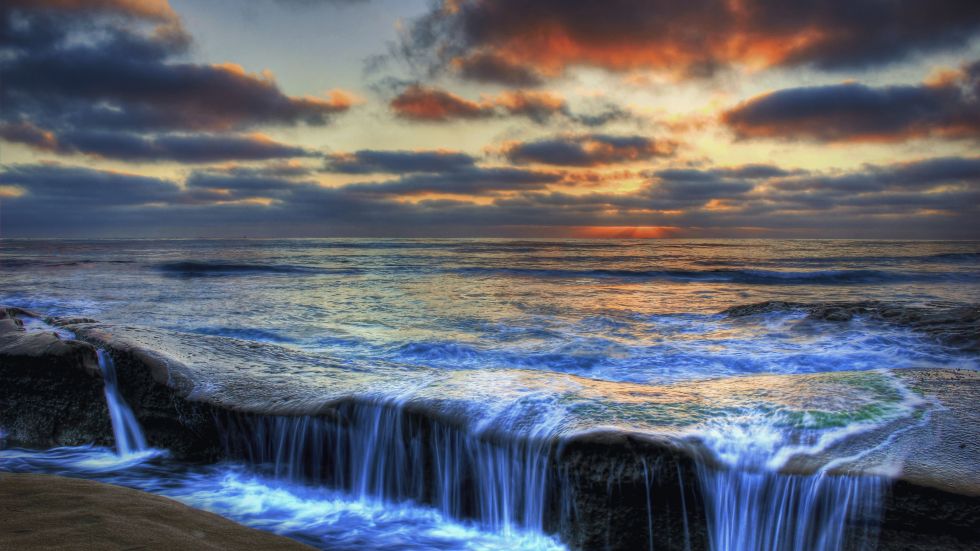 The Sunset glows over the ocean as this great body of water splashes down into cracks deep inside of the earth.