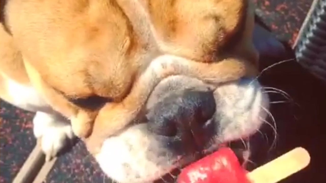Adorable bulldog keeps cool during a summer heatwave with a popsicle.