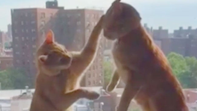 Two cats seem like boxers as they paw at each other in a window ledge