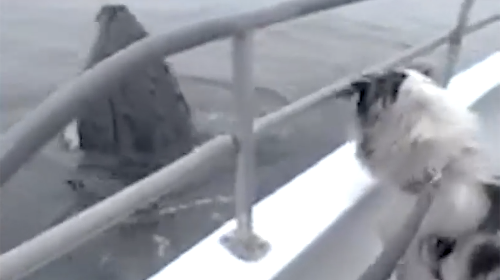 Skipper, an Australian shepherd, was excited to see the two giant whales swimming around the whale-watching tour boat.