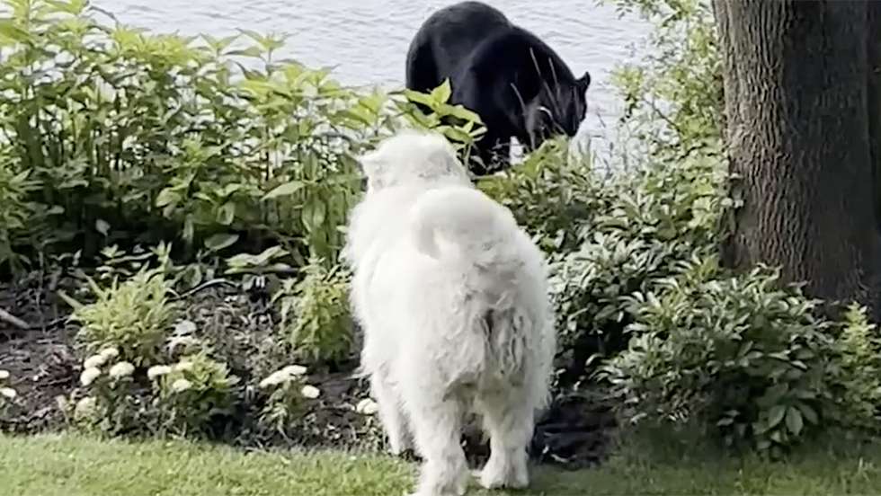 Lars, a Great Pyrenees, was very interested in a bear he saw in Cohasset, Massachusetts. His owners were able to get him safely inside by remaining calm during the encounter.