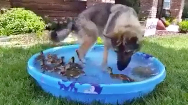 German shepherd whose mothered ducklings since they were born enjoys pool days with them.