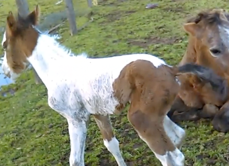 Adorable pony is trying to get used to his long, wobbly legs.