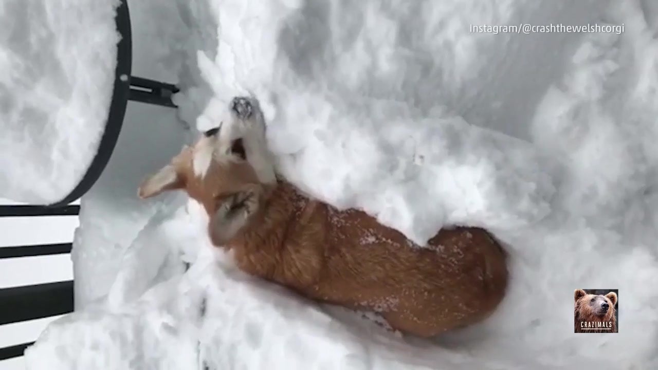 A corgi has to wiggle backward to get out after digging into a deep pile of snow.