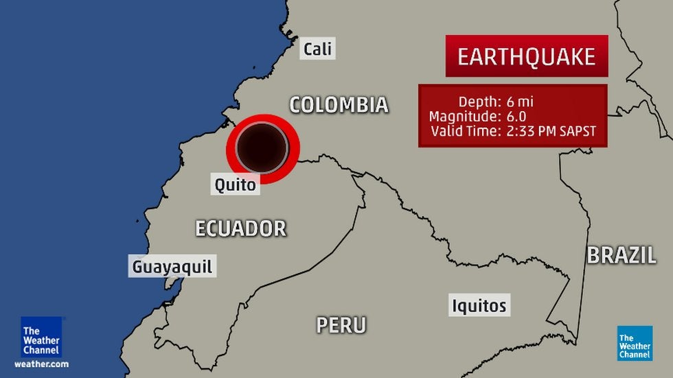 The magnitude-6.0 temblor struck the province of Carchi in northern Ecuador at 2:33 p.m. local time (3:33 p.m. EDT). The epicenter was near San Gabriel, a town of 33,000 near the Colombian border. Shaking was reported in Ecuador's capital, Quito, as well as farther away in its largest city, Guayaquil.