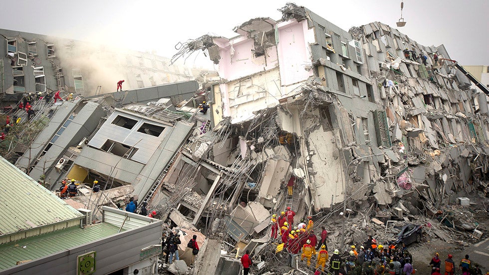 Rescue personnel search for survivors at the site of a collapsed building on Feb. 6, 2016 in Tainan, Taiwan. A magnitude-6.4 earthquake hit southern Taiwan early Saturday, toppling several buildings and killing at least two people in Tainan, according to local news reports. (Ashley Pon/Getty Images)