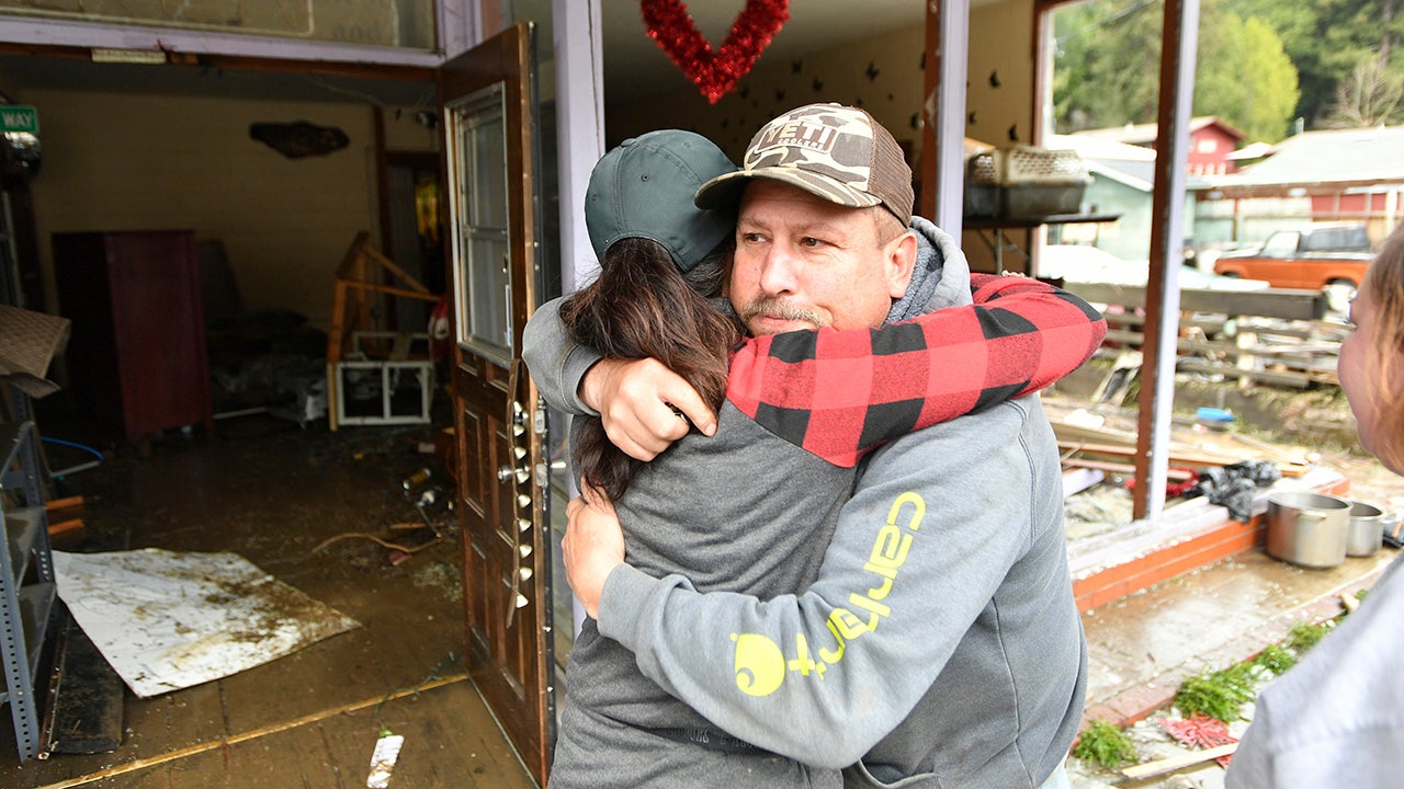Guerneville resident Pete Swinney, right, hugs shop owner Bonnie Plevney as they talk about her ruined shop Bonnie Sew Good in Guerneville, Calif., on Friday, March 1, 2019. Authorities have reopened the roads into two towns cut off for days by a rain-swollen river and residents and work crews have started cleaning up the muck that flooding left behind. (AP Photo/Josh Edelson)