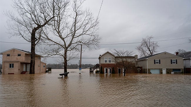 A neighborhood is inundated by flooding from the Ohio River, Tuesday, Feb. 12, 2019 near Louisville, Kentucky.