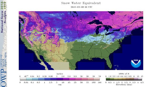 Estimated water content of the snowpack over the U.S. on Mar. 8, 2019. Parts of the northern Plains, upper Midwest, northern Great Lakes, and northern New England were estimated to have at least 4 inches of water contained in the snowpack.