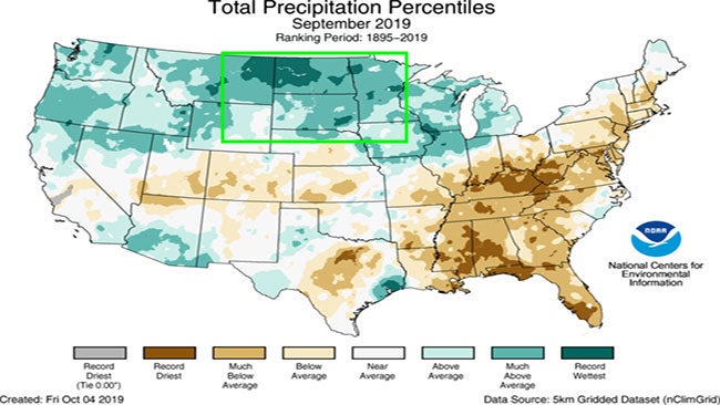 This ground was saturated by the wettest September in 125 years in North Dakota and among the top three wettest Septembers in South Dakota, Montana and Minnesota.