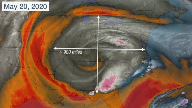 This water vapor image taken on May 20, 2020, shows upper-level moisture - in gray, white and pink colors - stretched roughly 900 miles across.