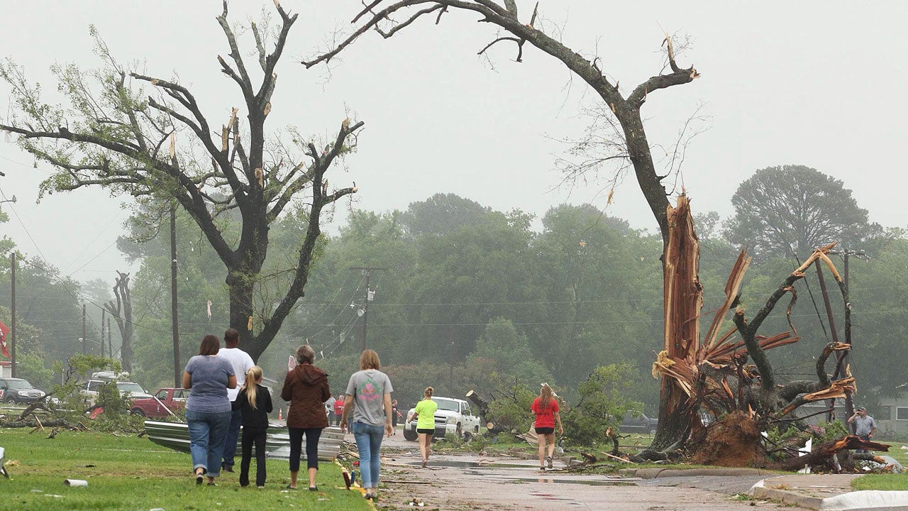 Residents survey damage near an elementary school, caused by severe weather, Monday, May 11, 2015, in Van, Texas. (AP Photo/Todd Yates)